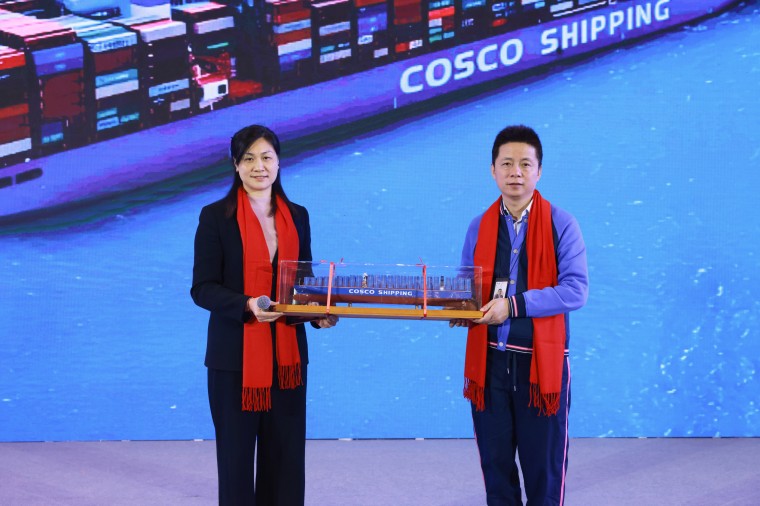 宁波中远海运集装箱运输有限公司 总经理 阎菲,重点阐述了公司与凯越集团从航线合作到全面协同的信任共建过程,展示了中远海运在构建稳定、韧性供应链方面的体系化能力。阎总向汤总赠送COSCO船模,表示将继续担当凯越最可靠、最坚定的“海上动脉”与“陆上支脉”,不仅成为供应链的“稳定器”,更努力成为推动外贸出口业务增长的“加速器”。